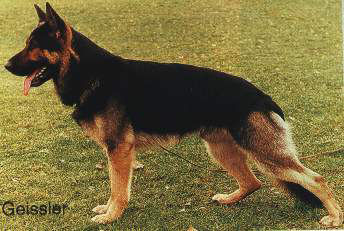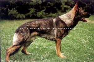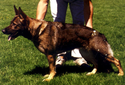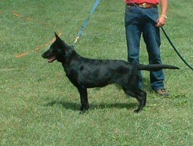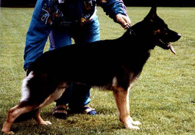 Sire Over medium size, medium strong, normal topline, croup should be very slightly longer. Good angulations, normal chest proportions, straight front, straight footfalls. Good gaits with strong rear propulsion, front reach should be somewhat more free. Sure temperament, TSB pronounced, outs. Linebred E - Breed vom Körbelbach (Evi - Ester) 5-5 |