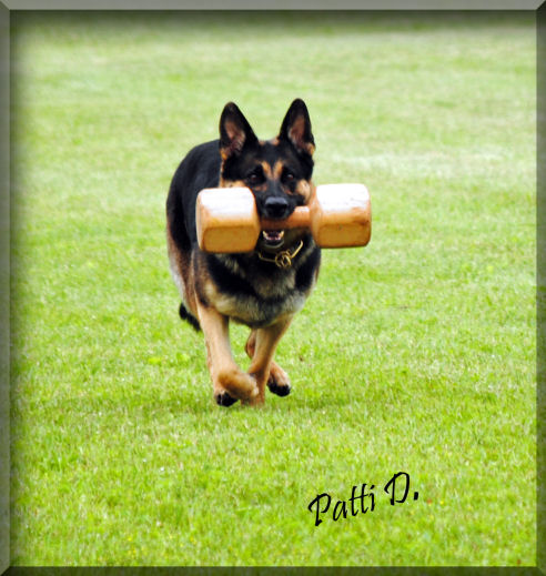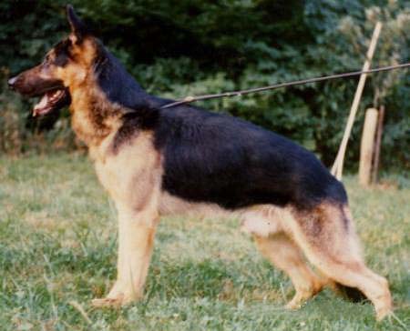 Sire 'SG' Belschik vom Eicken-Bruche SchH3 (2X BSP, WUSV), IPO3, FH KKL2 a1 ZW:86 SZ:1836831 06/18/92 DNA Linebreeding: Eros Busecker Schloß (5-5) Klein, kraft-, gehaltvoll, Widerrist, Rücken und Brustentwicklung normal, Kruppe kurz und waagerecht, vorne, hinten gute Winkel, Front gerade. Ellenbogen nicht ganz geschlossen vorne geringfügig zeheneng, hinten korrekt tretend. Gänge genuegend raumschaffend, Nachschub darf wirksamer, Vortritt freier sein. Rückenverhalten gut. Wesen sicher, Kampftrieb, Härte, Mut ausgeprägt, läßt ab. |